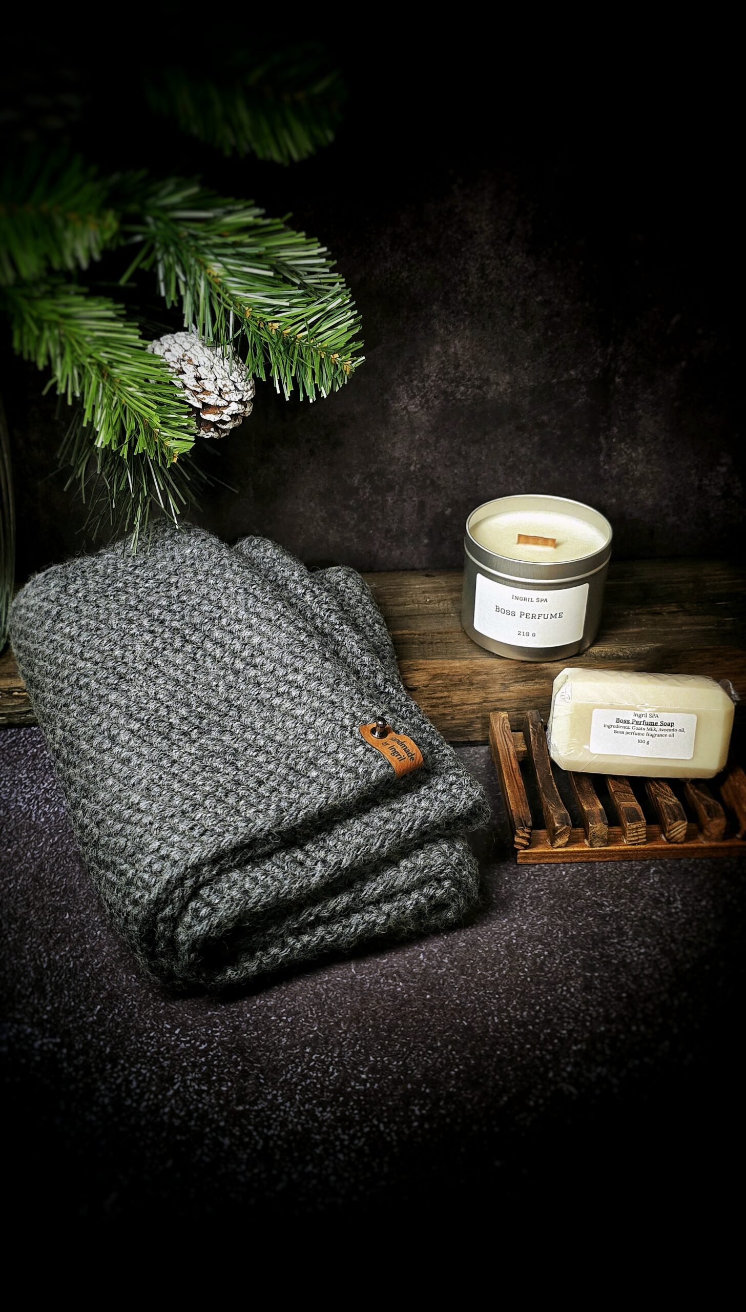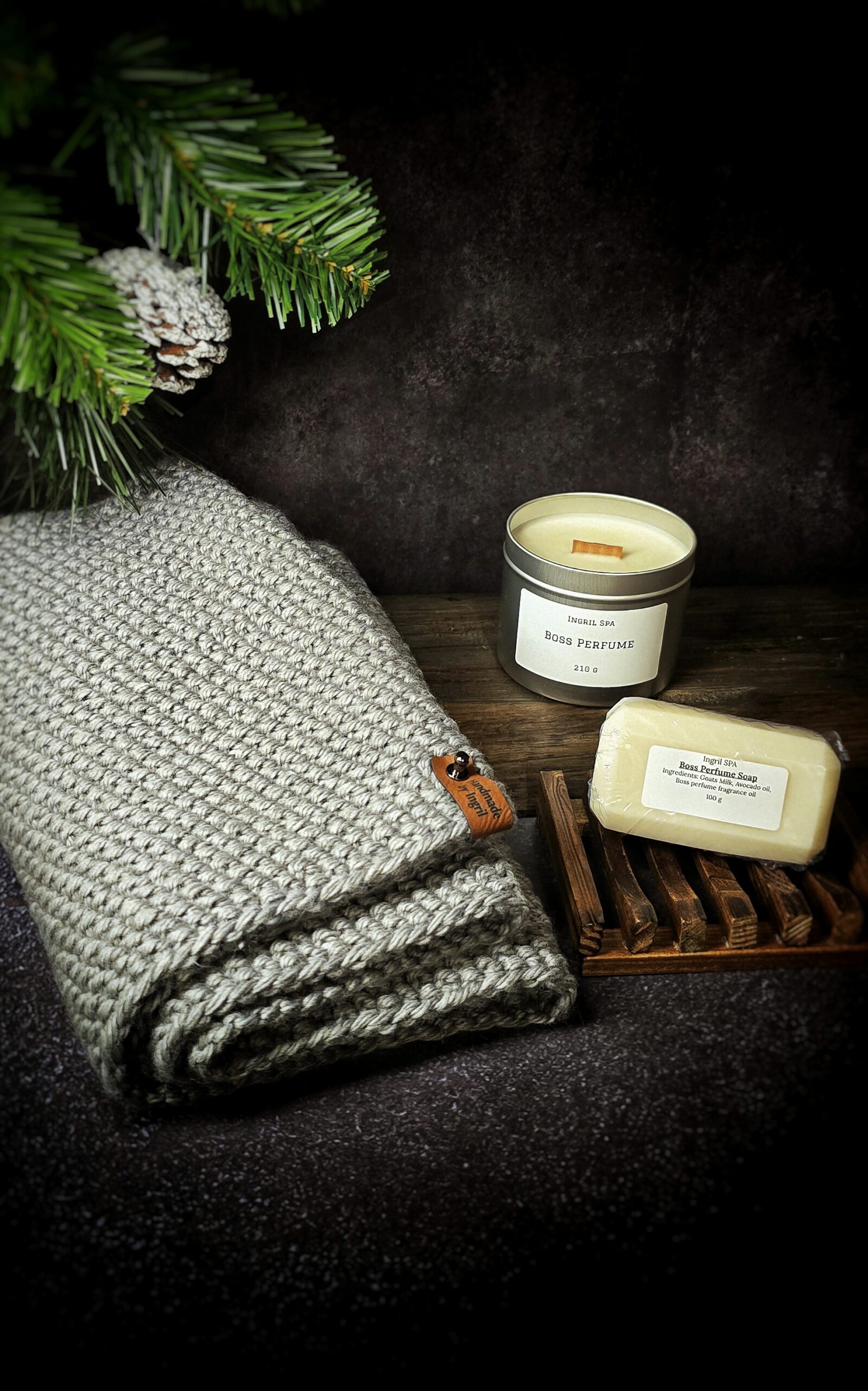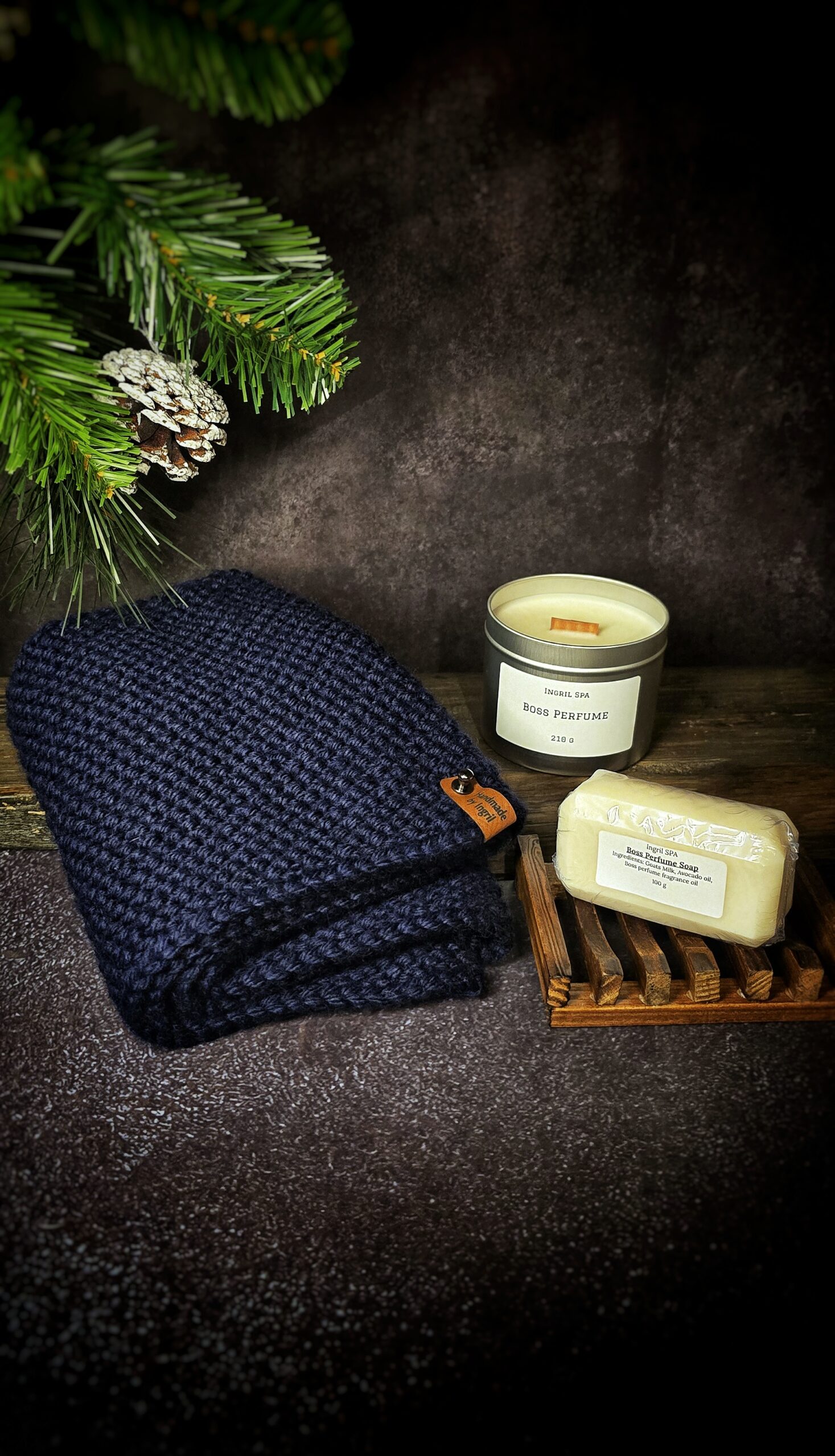 The Christmas set consists of Infinity Scarf for Men, Boss Perfume Soy Wax Candle and Luxurious Boss Perfume Soap.